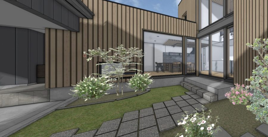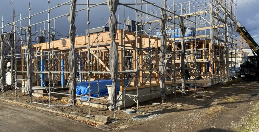 20日午後、軸組の建方。 2回部分に移っている。 手前は車庫。