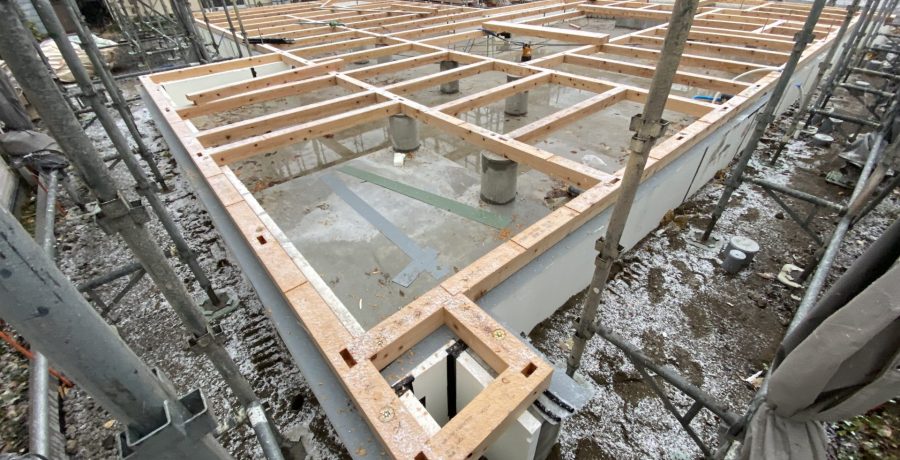 11月18日、土台を設置する。 初雪。 床下の空間が基礎立ち上がりが無いくオープンな基礎。 ・床下暖冷房の暖気と冷気の空気溜まりがない一様に拡散する。 ・梅雨にエアコンで除湿ができる。 ・カビや結露の恐れが少ない。 ・底盤コンクリートの蓄熱効果が大きい。