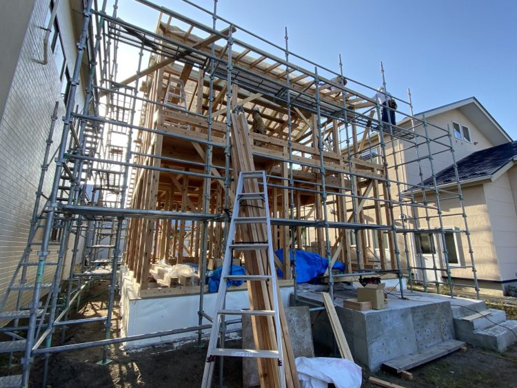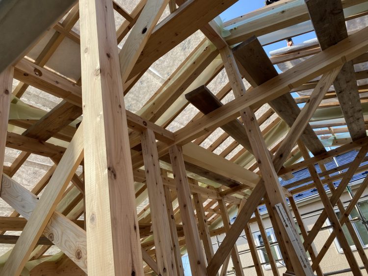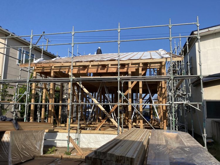小屋梁の上に垂木+透湿・防水シート+通気層(通気胴縁)+野地板合板+ルーフイングを設置する。
