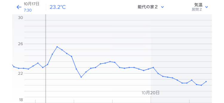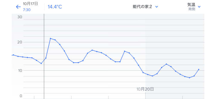 居間室温:最低室温20.4℃ この時の自然温度差12.9℃。