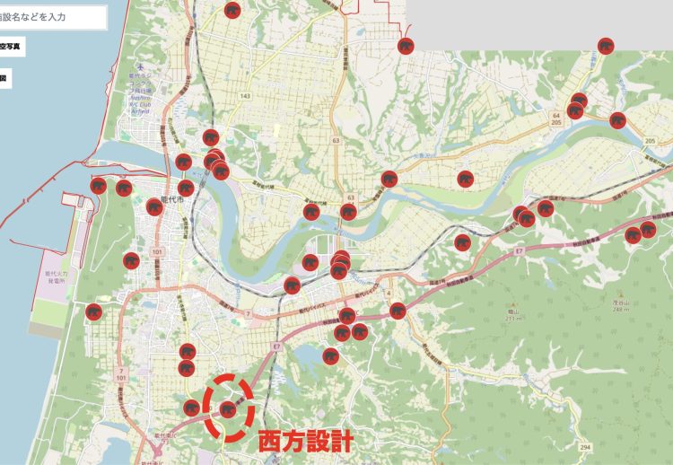 2025年10月24日の秋田県の「クマダス」に熊が出現した位置がプロットされた能代市の地図。