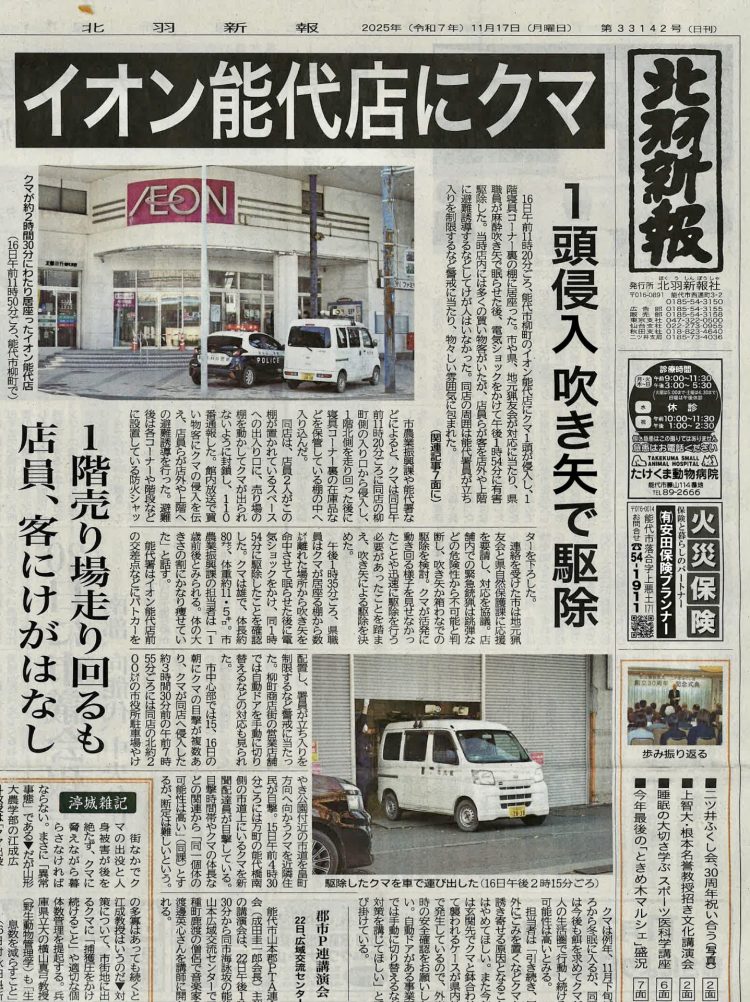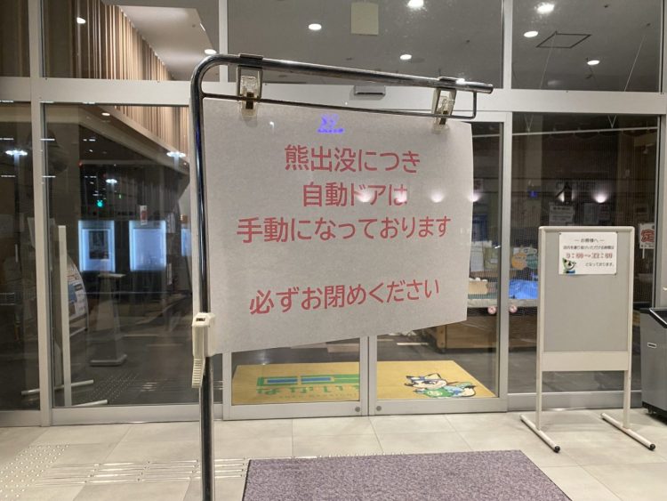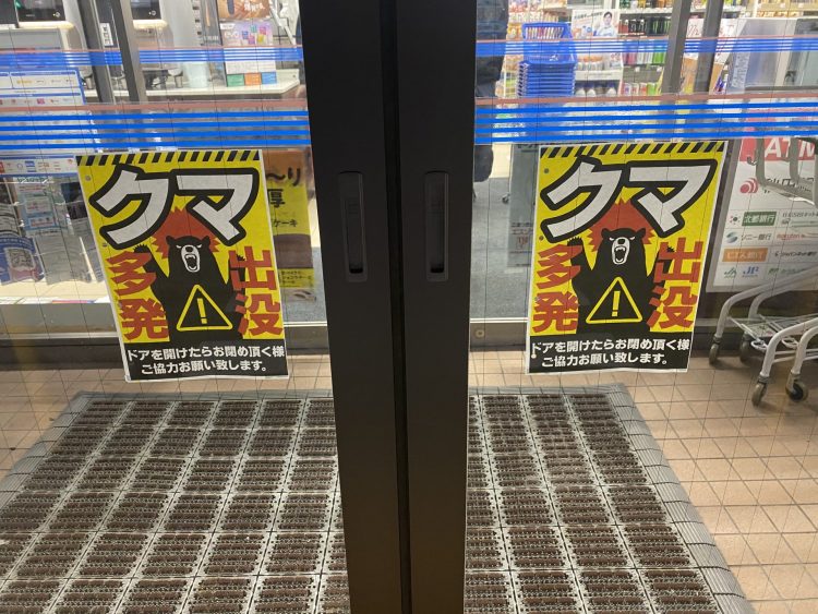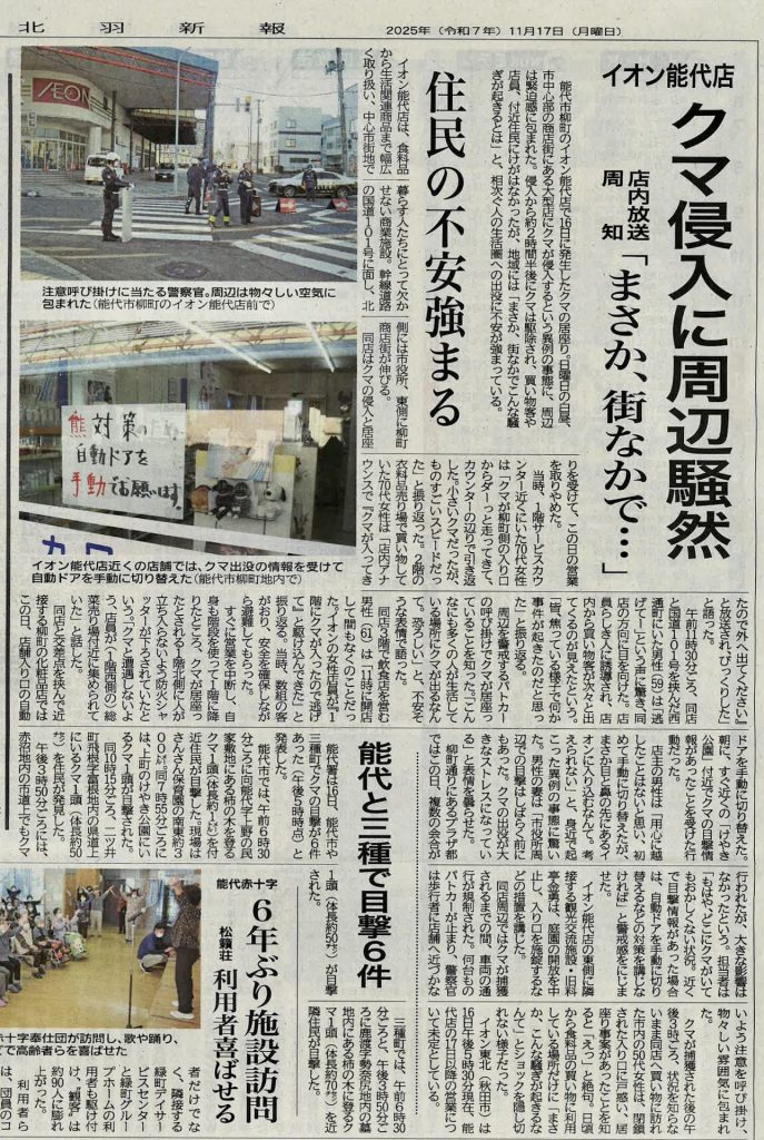 郊外のイオンショッピングセンターでなく、 街中のイオンに熊が突入。 北羽新報から転載。 秋田市や能代市の自動ドアは手動になっている。 能代市のコンビニ。 秋田市のナカイチ。
