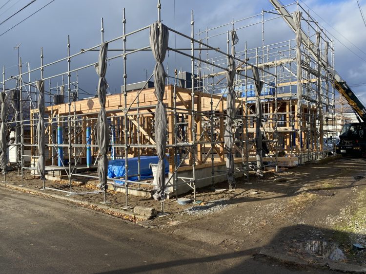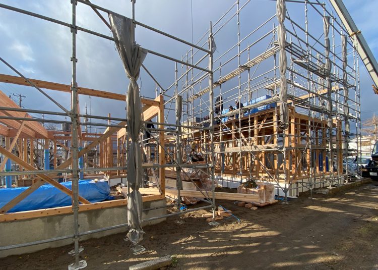 20日午後、軸組の建方。 2回部分に移っている。 手前は車庫。