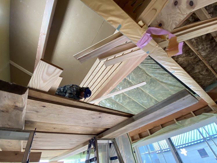 居間の天井の秋田純白美人杉板の貼り付け。 秋田純白美人杉目透かし張り→木質繊維板(吸音)→アースウール(グラスウール 断熱材・吸音材)。 吸音効果が大きい。