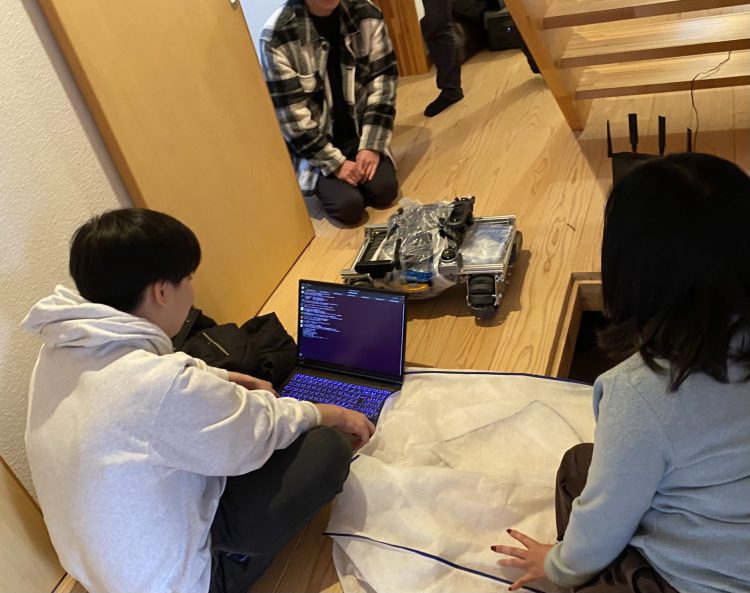 秋田県立大学の大塚先生と伊藤先生と学生二人が床下診断ロボットのデモ調査を自宅で行った。