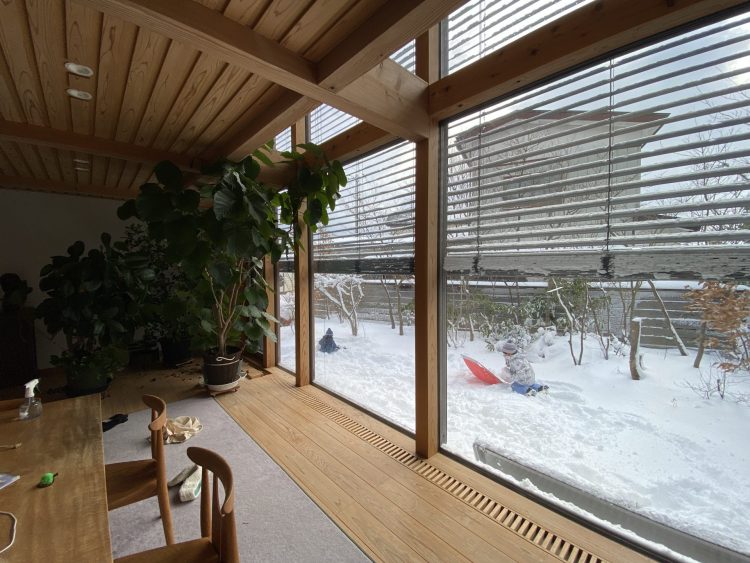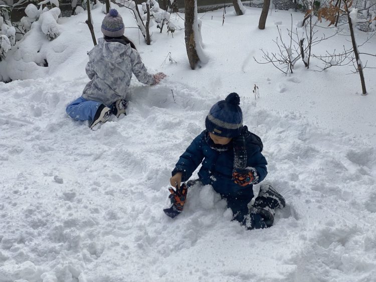 本格的積雪12月27日、遅い。 早速、孫は雪の外で遊ぶ。