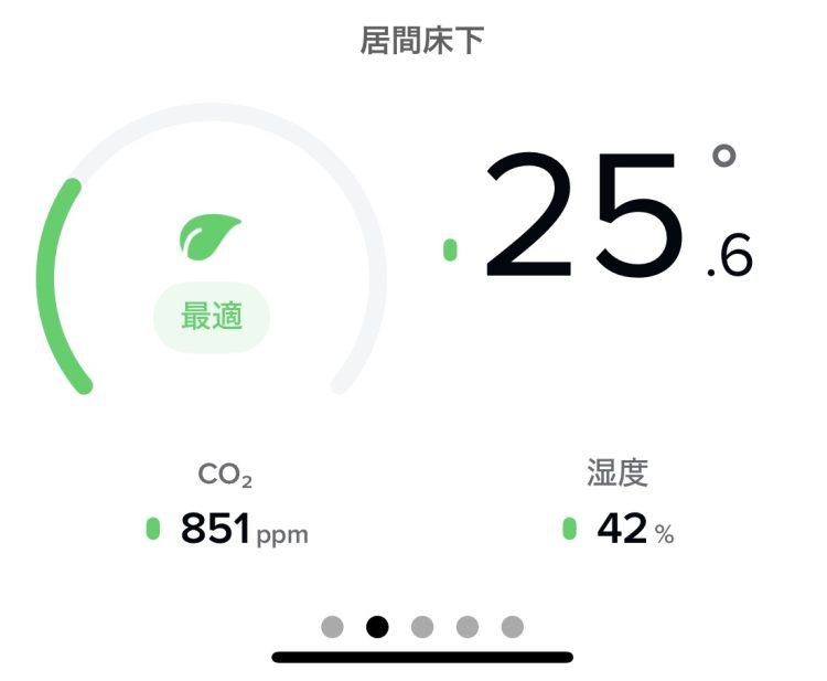 センサーの端末は居間、床下、床下給気口、洗面室、トイレ、2階寝室、2階ホールにある。