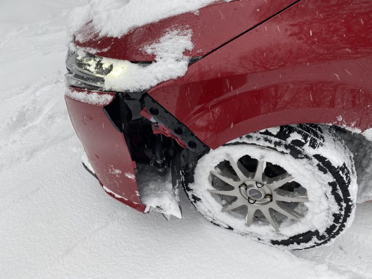 路肩から出っ張ったの雪の塊に車の角をぶつけた。
