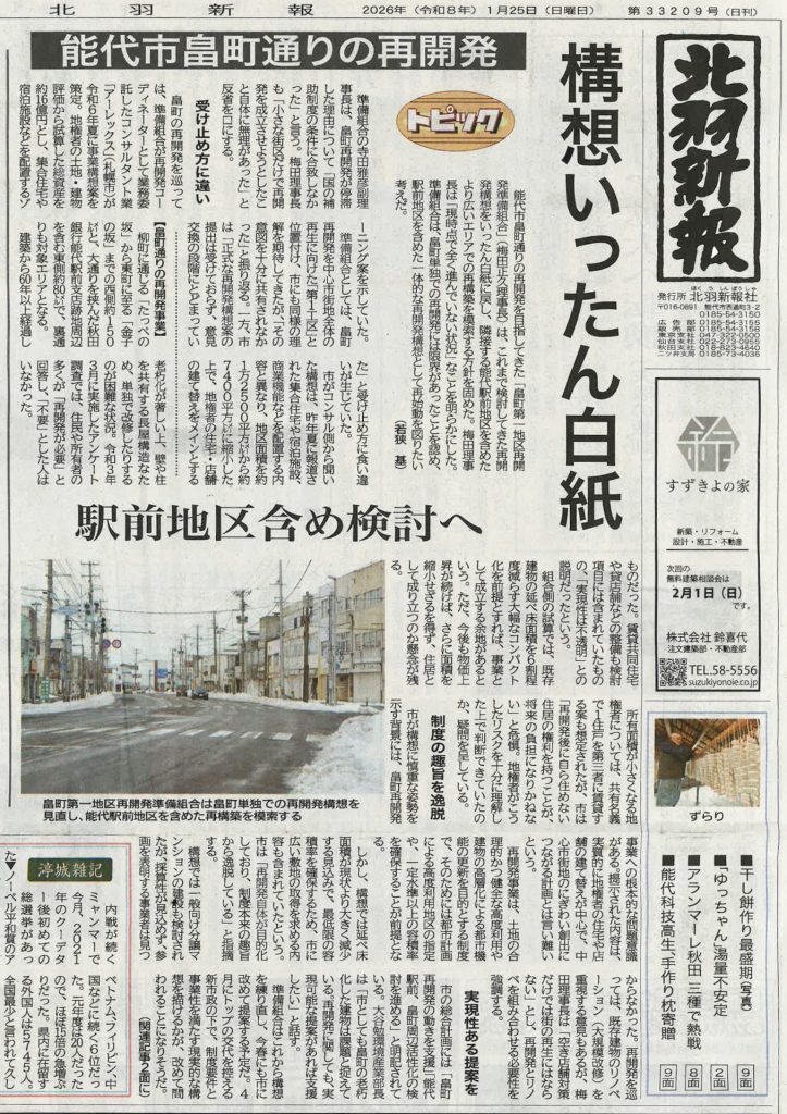 組合が畠町再開発構想をいったん白紙に戻すの北羽新報の記事。