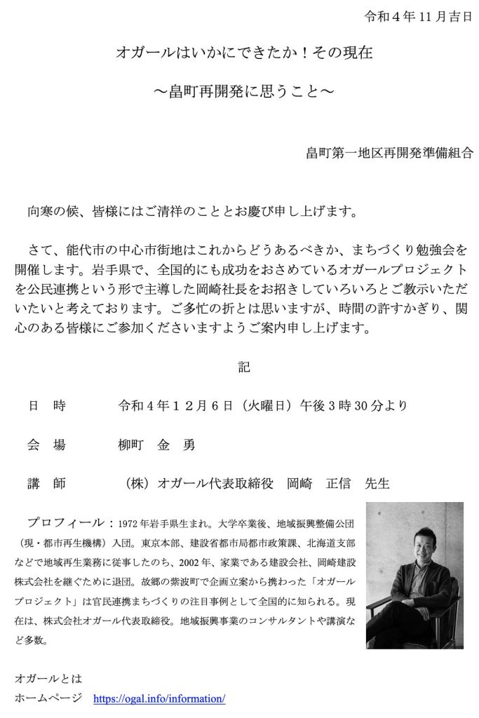 岡崎さん講師の テーマ「オガールはいかにできたか!その現在 」 ~畠町再開発に思うこと~ の研修会があります。 能代を豊かにしましょう。 参加をお願いします。