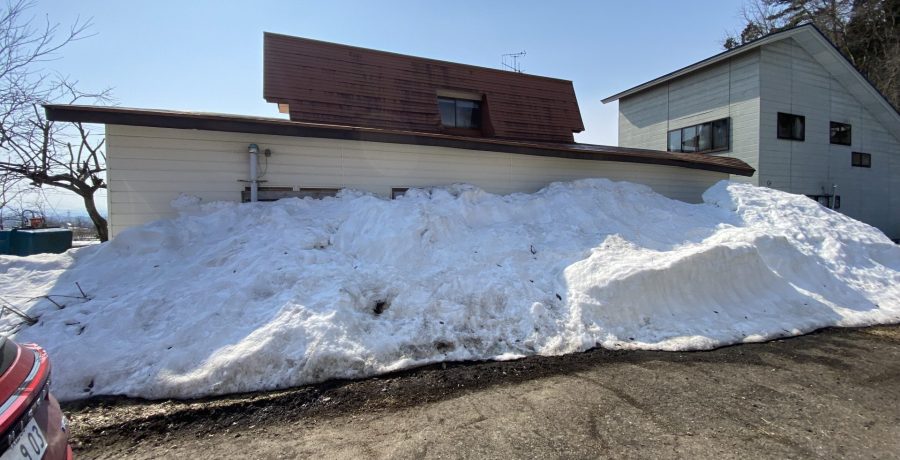 今朝に敷地を見に行った。 写真のよう屋根からの雪が溶けないで大量にあった。 どう雪を処理するかが課題になる。 屋根の形状である。