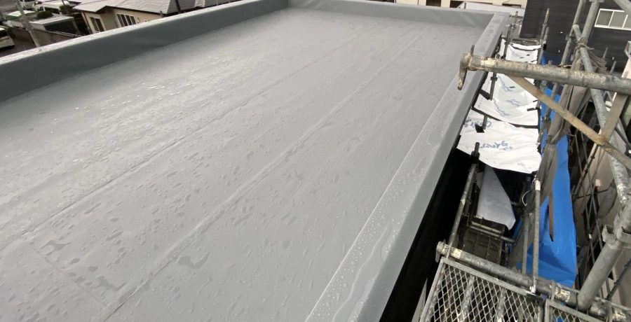 12月11日の現場、屋根のシート防水。 隣地や道路と近距離で落雪が少ないパラペット屋根にした。