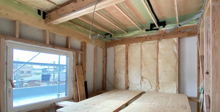 12月8日、9日の外壁付加断熱施工の状態。 付加断熱グラスウール16k厚105mm。 ファサードラタン下地の透湿・防水シートのウートップサーモファサード。