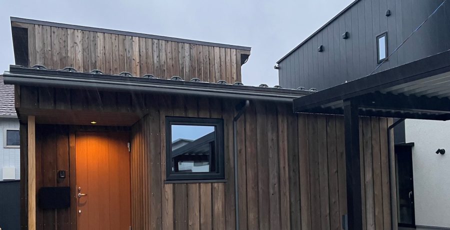 19日のQ1住宅十七流れの外観。 赤ナマハゲ秋田杉の敷目板張り。
