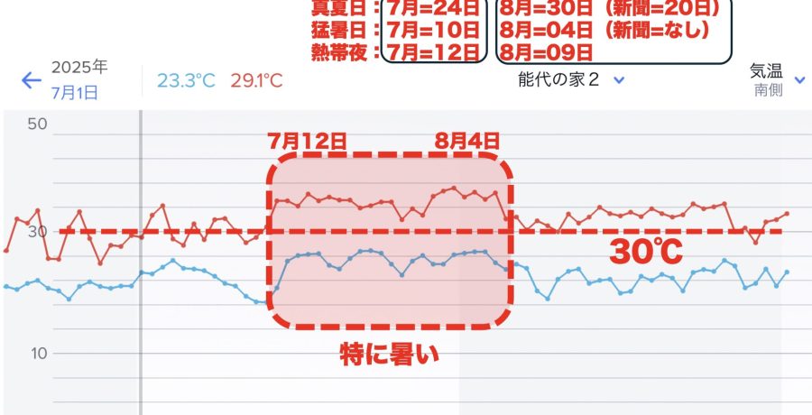 8月9日、今日は38℃を超える猛暑日。 これまで 真夏日 30℃以上 19日 猛暑日 35℃ 4日 熱帯夜 25℃ 13日 まだまだ続く。 吉祥に住まいの家族が新居の相談に5日に能代に来られ、 涼しいと。外気温は33℃。 吉祥寺は38℃超え。 エアコン冷房消費電力350Wh 室温26.5℃前後 8月6日 日外付けブライ...