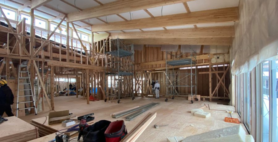 1月28日の能代カトリックこども園の現場。 トップサイドライトの採光が効いて明るい。 屋根の形は雪の処理で決まる。 基礎断熱の床下暖房。