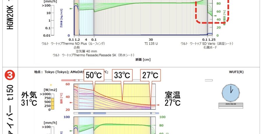 非定常ソフトのWUFIで屋根WFとGWの費用対効果を考えてみた。 東京2025年夏8月8日13:00 ❶図WF(ウッドファイバー断熱材)厚300mm ❷図GW(グラスウール20K断熱材)厚300mm西方設計標準仕様 ❸図WF(ウッドファイバー断熱材)厚150mm ❷図は西方設計の屋根の断熱材の標準仕様はGW(グラスウー...