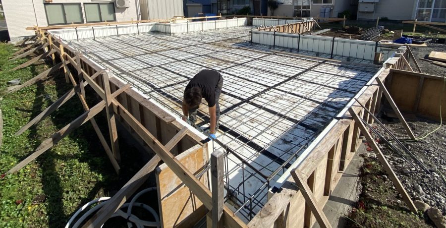 9月3日の1日で配筋工事を終えた。 素早い。 底盤に埋め込まれる扁平地中梁で底盤が凸凹にならない。 地根伐りも砕石地業も凸凹にならない。 転圧された地業・地盤を痛めないので強度的に有利である。