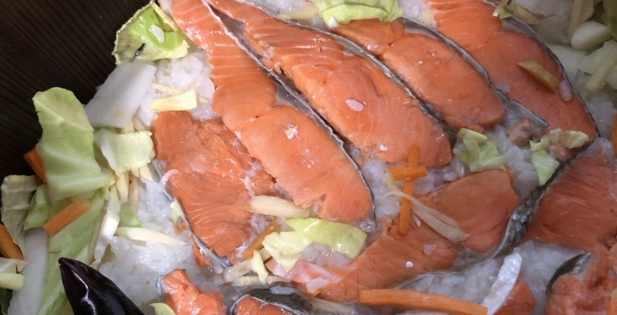 季節ハタハタが極めて不漁で昨年に引き続き飯寿司を諦めたが、 妻が紅鮭で飯寿司を作った。 以前にも不漁の時に季節ハタハタと鮭を半分半分にした。 おいしかった。 ノウハウは妻がもっている。 8年前の写真