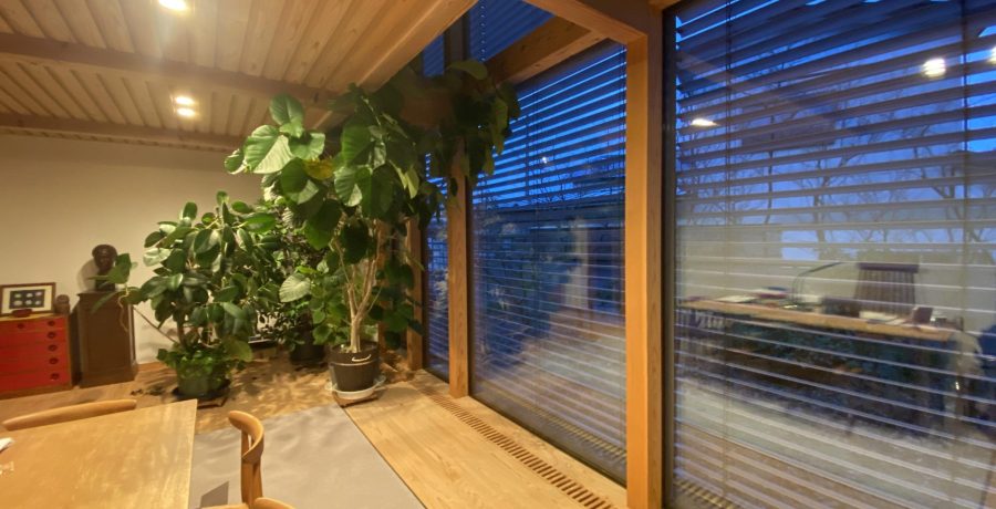 冬至の22日が過ぎ、24日の今朝7時。 これまでの冬至の朝7時は真っ暗であったが、 24日の今朝7時はいくらか明るくなった。 24日今朝8時。 外は毎日続いている曇天だが、 外付けブラインドを室内側に斜めにし、 ライトシェリフ効果の反射光で室内を明るくする。 効果が大きい。